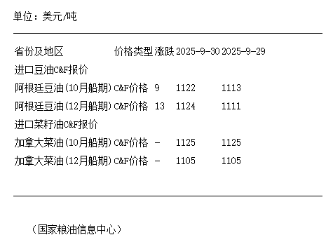9月30日进口阿根廷豆油及加拿大菜籽油C&F报价