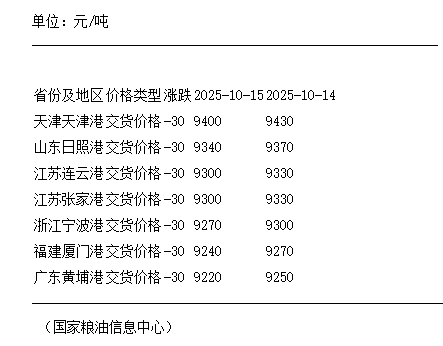 10月15日 24度棕榈油国内各港口交货价格下跌
