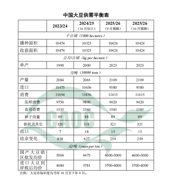 2024/25年度,国产大豆销区批发均价每吨4475元,较上年下跌10.6%,低于预期价格区间;进口大豆到岸税后均价每吨3781元,较上年下跌7.4%,在预期价格区间内。本月对2025/26年度市场供需数据不做调整。国内市场方面,主产区陆续进入集中收获期。东北产区长势总体良好,结荚鼓粒饱满,丰产预期较强;苏鲁豫皖产区部分地区因生育期遭遇高温干旱及9月下旬持续阴雨天气,对新豆单产和品质形成不利影响,后期需持续跟踪评估。当前东北地区贸易主体入市积极,市场优质优价特征明显,华北黄淮地区大豆上市推迟,市场交易清淡。国际市场方面,美豆主产区温暖干燥,利于大豆成熟与收割推进;南美新季播种进入关键阶段,巴西干旱天气不利于后续进度,阿根廷土壤墒情改善有利于早播。总体来看,全球大豆供应保持宽松状态。