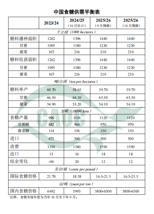 2024/25年度中国食糖产销结束,累计产糖1116万吨,较上年度增加120万吨;食糖年度均价为每吨5993元,在预测范围内,比上年度每吨跌498元,跌幅7.7%;国际原糖年度均价为每磅18.58美分,在预测范围内,比上年度每磅下跌3.1美分,跌幅14.3%。本月对2025/26年度中国食糖供需形势预测与上月保持一致。8月份内蒙古降雨偏多,不利于甜菜糖分积累及起收,糖厂开机时间推迟,对甜菜糖产量的影响需进一步跟踪评估。9月底10月初广东、广西等甘蔗主产区受台风影响,出现甘蔗倒伏等现象,后期需持续关注灾后甘蔗生长恢复情况。