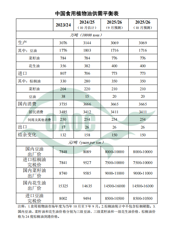 本月,2024/25市场年度结束,中国食用植物油产量3144万吨。由于产量增加,2024/25年度食用植物油进口量较上月调减50万吨至706万吨,其中棕榈油、葵花籽油进口量分别调减30万吨、20万吨。2024/25年度国标三级豆油、三级菜籽油、一级花生油出厂价均价分别为8089元/吨、9585元/吨、14635元/吨,均在预估区间内。本月对2025/26年度中国食用植物油供需预测数据不做调整。据气象部门预测,10月份华北西部、黄淮西北部区域降水偏多,相应花生产区需做好抢收工作,并及时晾晒和烘干,防止新季花生霉变。