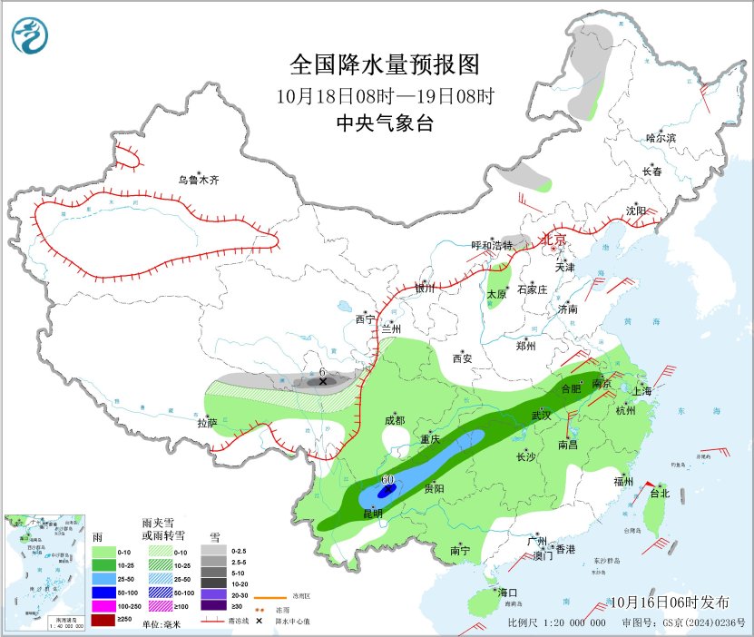 图4 全国降水量预报图(10月17日08时-18日08时)
