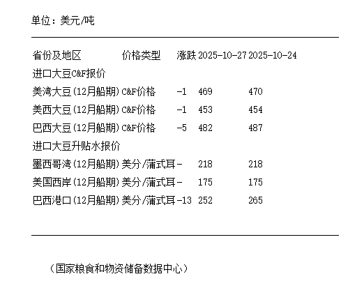 10月27日进口大豆到国内港口C&F及升贴水报价