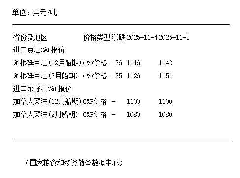 11月4日进口阿根廷豆油及加拿大菜籽油C&F报价