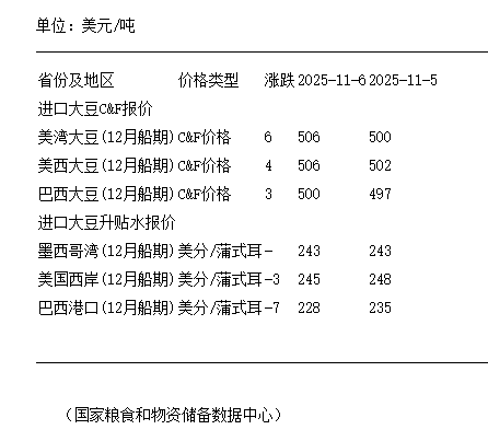 11月6日进口大豆到国内港口C&F及升贴水报价