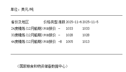 11月6日马来西亚棕榈油12月船期FOB报价