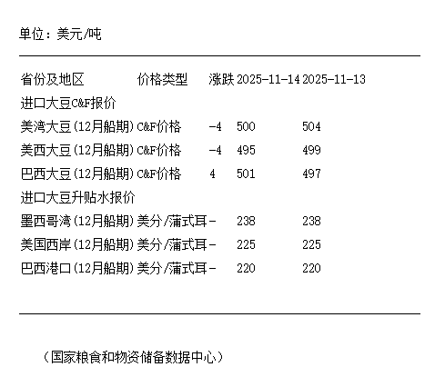 11月14日进口大豆到国内港口C&F及升贴水报价