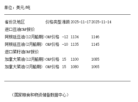 11月17日进口阿根廷豆油及加拿大菜籽油C&F报价