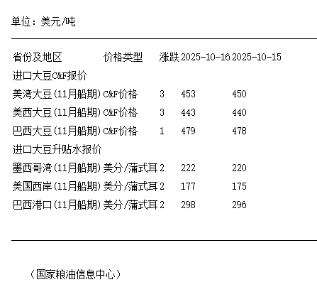 10月16日进口大豆到国内港口C&F及升贴水报价