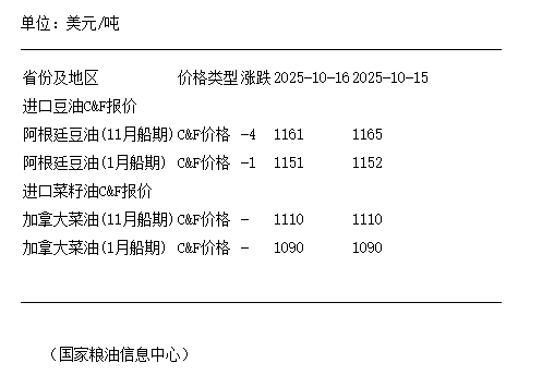 10月16日进口阿根廷豆油及加拿大菜籽油C&F报价