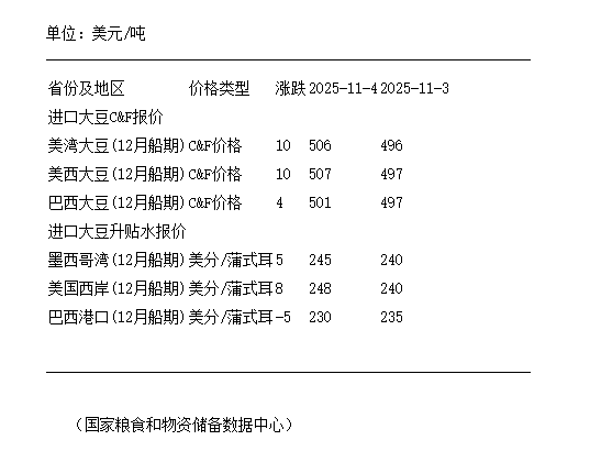 11月4日进口大豆到国内港口C&F及升贴水报价